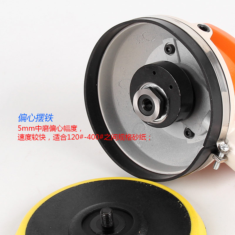 --粗磨偏心度幅度為9.5mm,扭力大,切削能力更大,適合重力打磨。工件一般幅面較大,要求打磨速度快,粗糙的打磨表面,如:玻璃鋼,UV,原子灰等材質(zhì)比較硬的工件,所用砂紙規(guī)格120#以下;