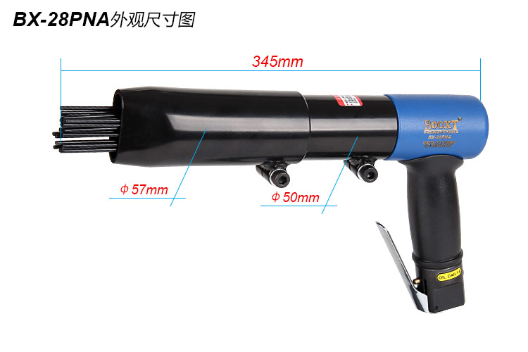 • 產(chǎn)品參數(shù): 活塞直徑:M28.5*86.8L 活塞沖程:39mm 槍針數(shù)量:28針 槍針尺寸:M3*180L 沖擊頻率:2700bpm 耗 氣 量:3.0cfm 全 長(zhǎng):345mm 凈 重:3.86kg