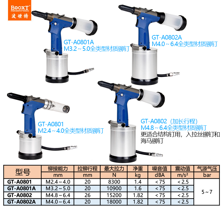 您當(dāng)前的位置: 首頁(yè) > BOOXT產(chǎn)品中心 > 氣動(dòng)鉚接工具 > 氣動(dòng)拉鉚槍 > 風(fēng)動(dòng)拉釘槍GT-A0802