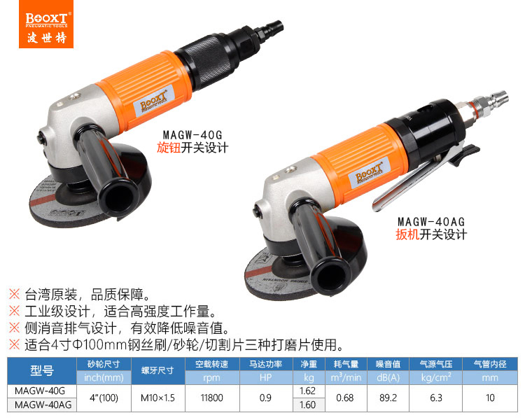 東莞市強(qiáng)勁五金工具有限公司提供臺(tái)灣BOOXT波世特品牌氣動(dòng)工具,4寸風(fēng)動(dòng)角磨機(jī)MAGW-40AG廠家直銷(xiāo),首件享特價(jià)。咨詢(xún)熱線:4008301980