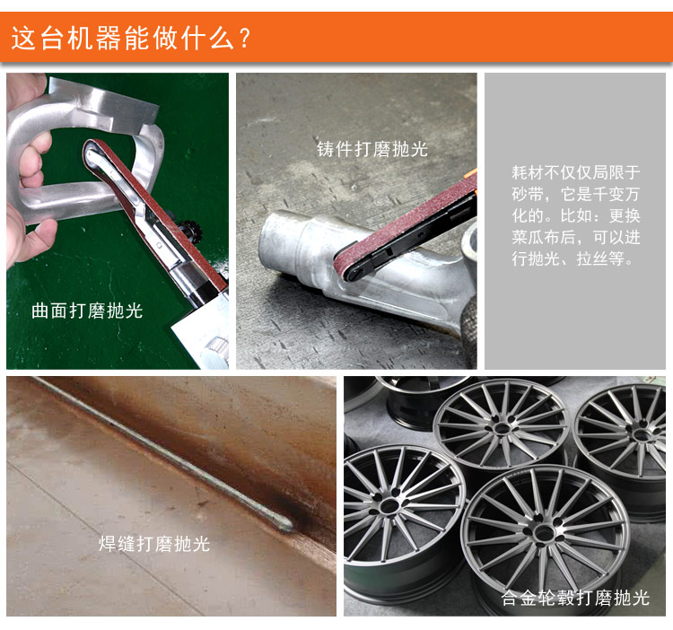 • 產(chǎn)品用途: 適用于各行業(yè)圓管和不規(guī)則工件打磨作業(yè),以及點焊部位焊接縫研磨打磨.去角去毛邊去毛刺。壓鑄廠/木器廠/鈑金廠/不銹鋼廠/鋼管鐵具家具廠等拋光,打磨,拉絲,倒角等作業(yè).【套裝/工業(yè)型】