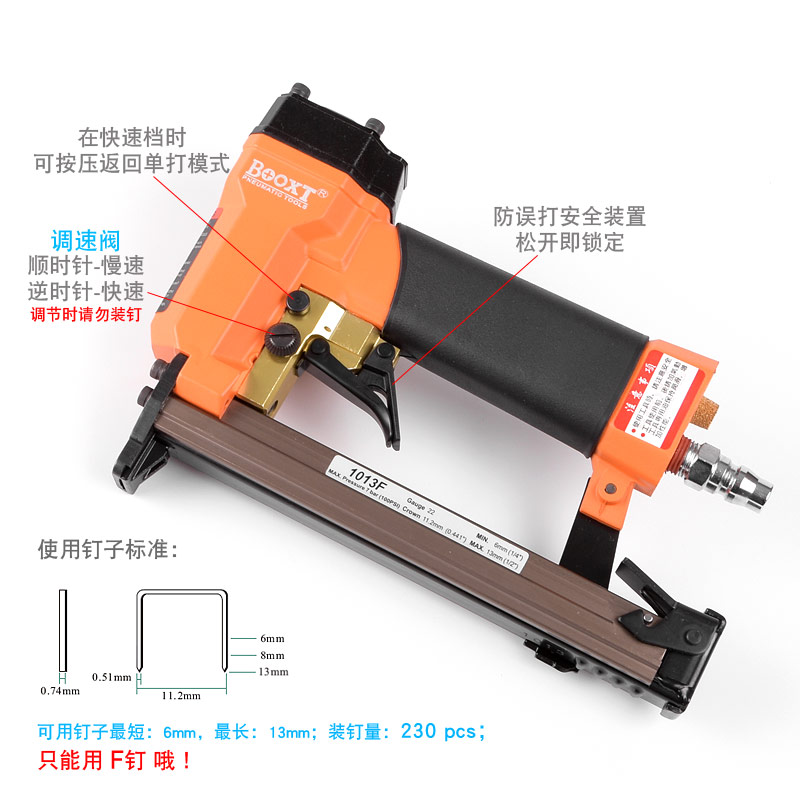 • 產(chǎn)品參數(shù): 特點(diǎn):可調(diào)節(jié)快速連打,自帶防誤打安全開(kāi)關(guān);釘子寬度:11.2mm;釘子跨度:10mm;釘腳尺寸:0.51×0.74mm;使用釘子長(zhǎng)度范圍:6-13mm;裝釘量:230個(gè);使用工作氣壓:0.6Mpa;推薦使用內(nèi)徑6.5mm氣管;平時(shí)多注意定時(shí)排放空壓機(jī)水份